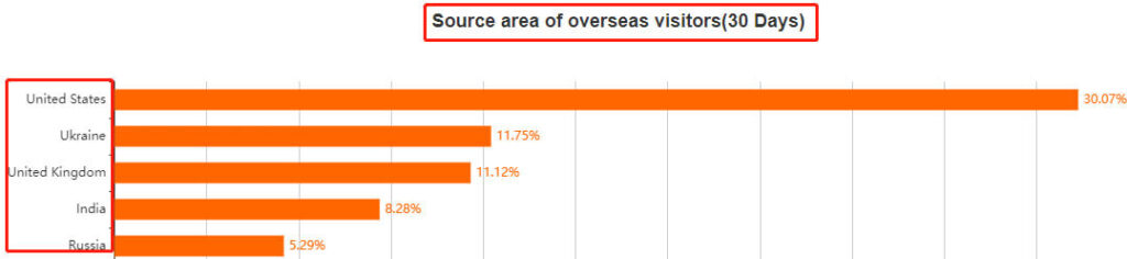Yiwugo is primarily used by the Chinese, with only 10% of users coming from outside China. Based on the latest 30-day overseas visitor data released by Yiwugo, the majority of overseas visitors are from the US, the UK, Ukraine, India, and Russia.