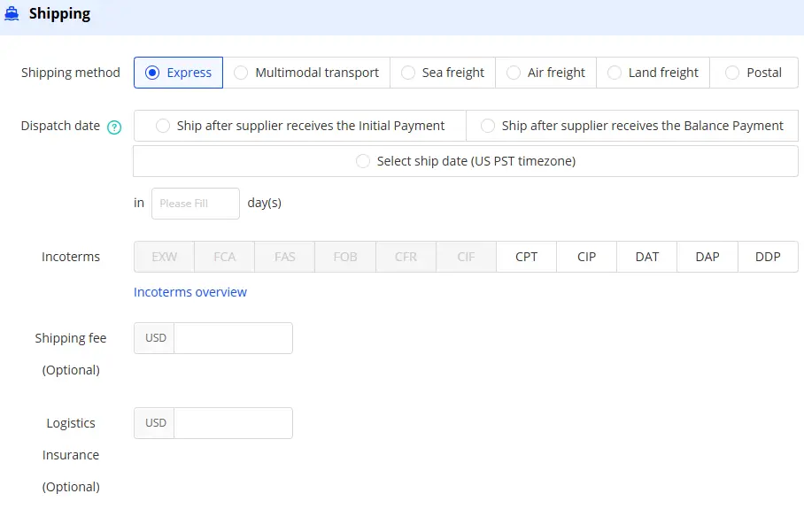 Specify shipping methods, dispatch date, trade terms, shipping address, etc.